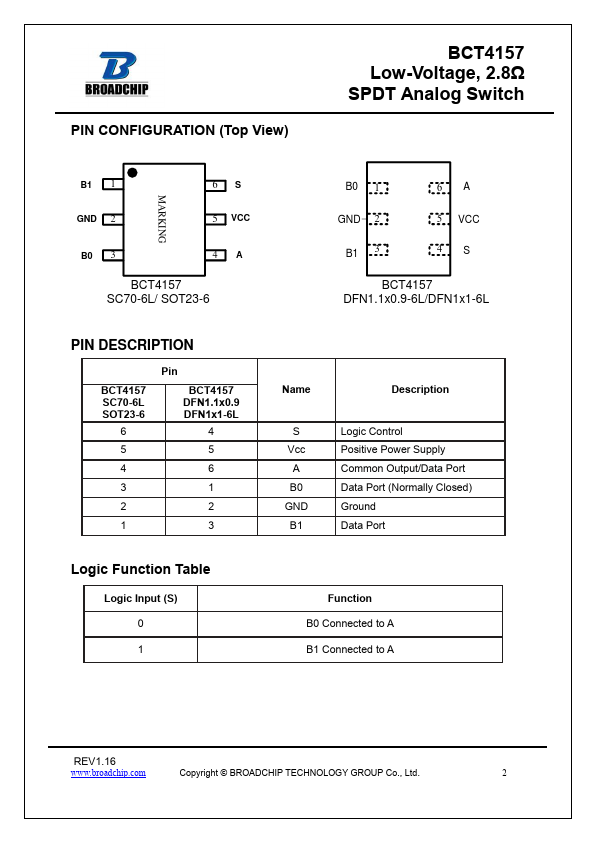 The BCT4157 is a high-bandwidth, fast single-pole double-throw (SPDT) CMOS switch.
