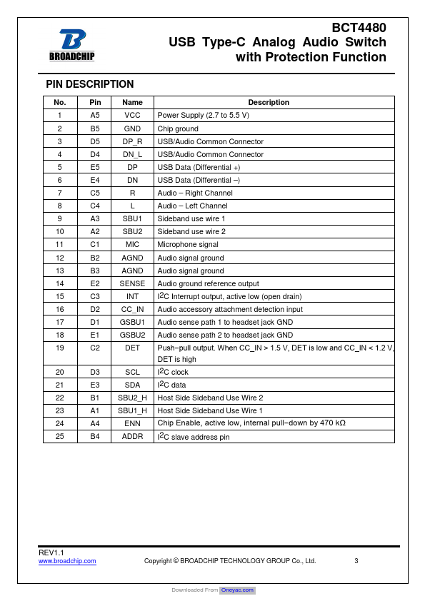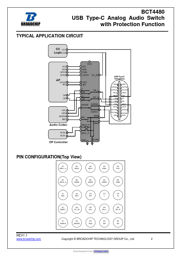BCT4480 is a high performance USB Type C port multimedia switch which supports analog audio headsets. C port to pass USB2.0 signal, analog audio, sideband us e wires and analog microphone signal. C receptacle side. Ball WLCSP Package (2.235 mm x 2.275 mm) packages.