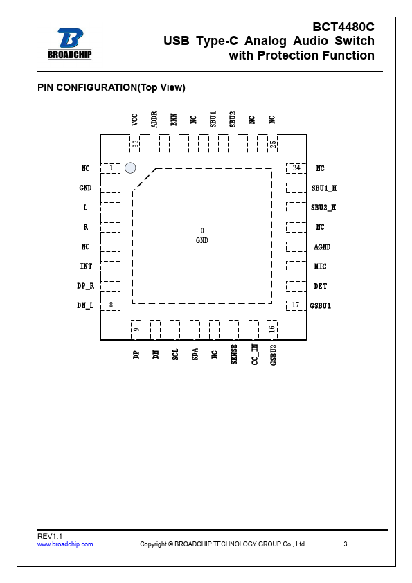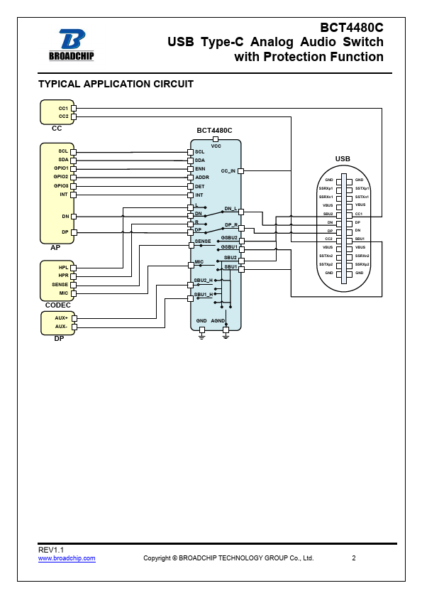 BCT4480C is a high performance USB Type C port multimedia switch which supports analog audio headsets. C port to pass USB2.0 signal, analog audio, sideband us e wires and analog microphone signal. C receptacle side.
