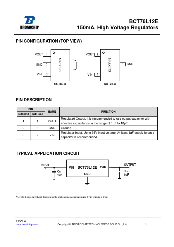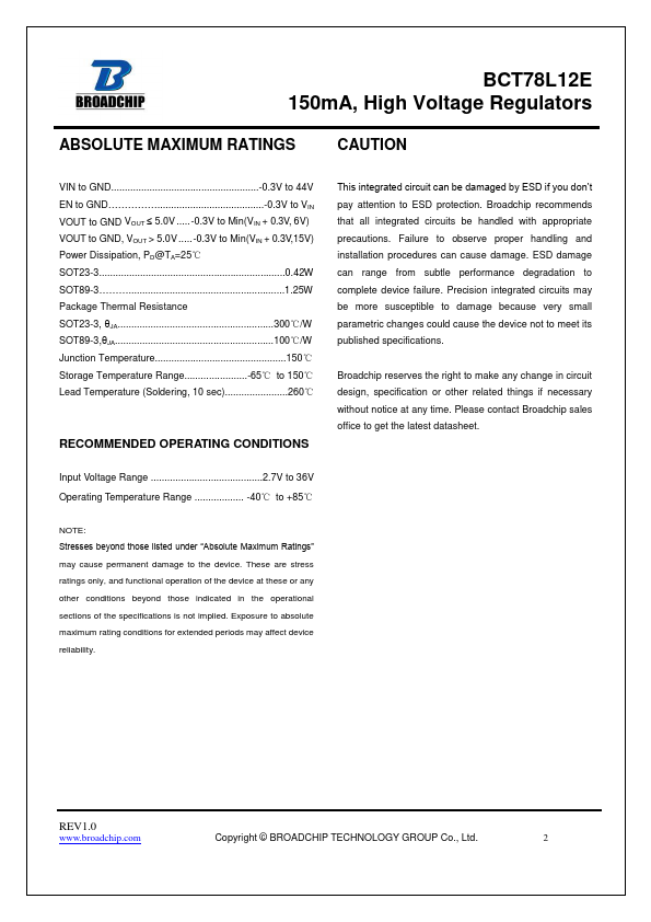 The BCT78L12E is a low-power, high voltage, low-dropout, CMOS linear voltage regulators operate up to 36.0V input voltage with 3uA low power.