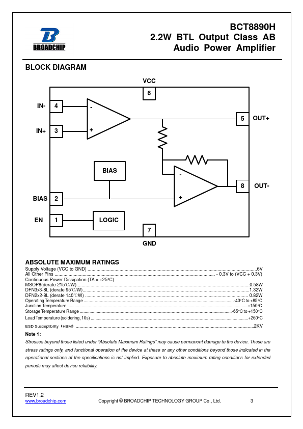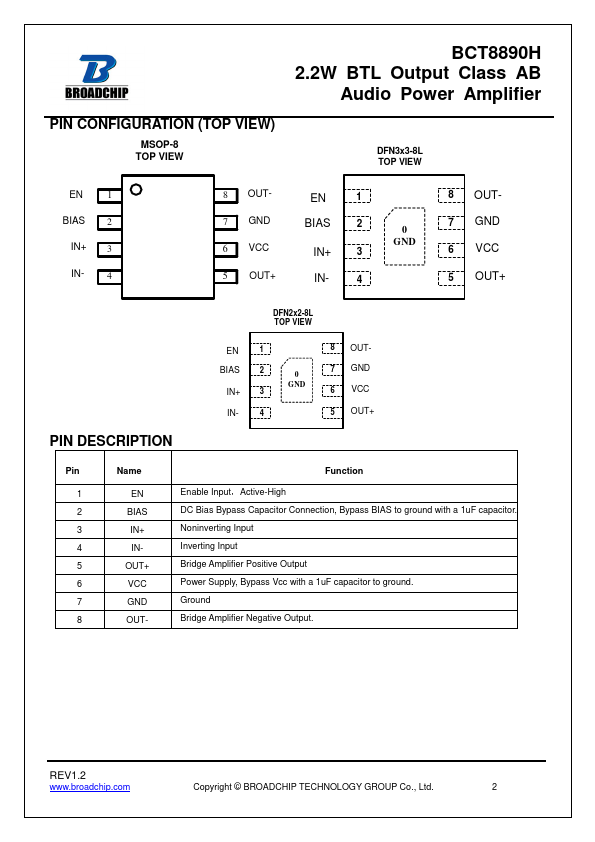 | Description | 2.2W BTL Output Class AB Audio Power Amplifier |