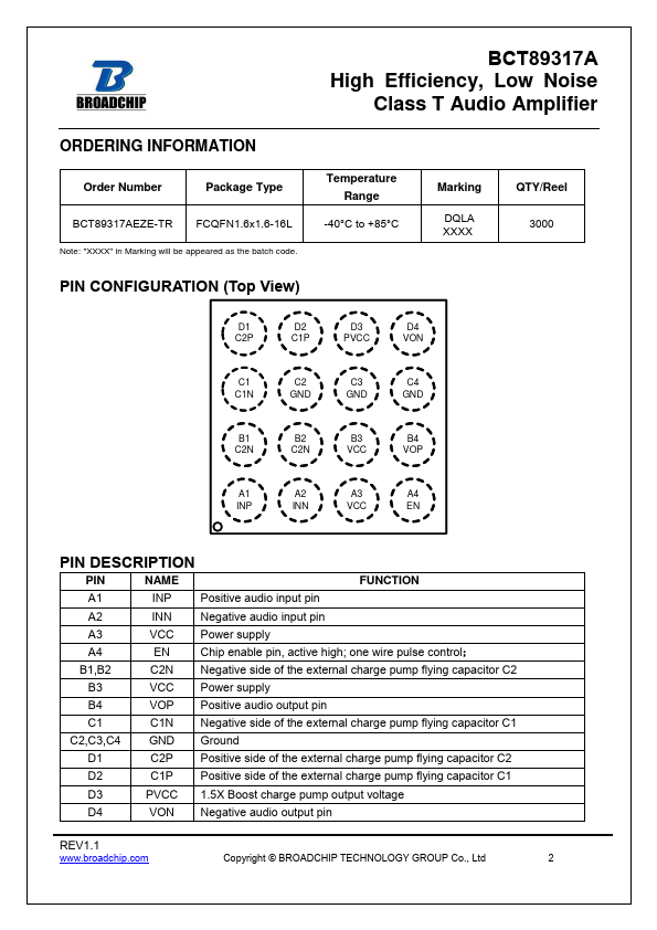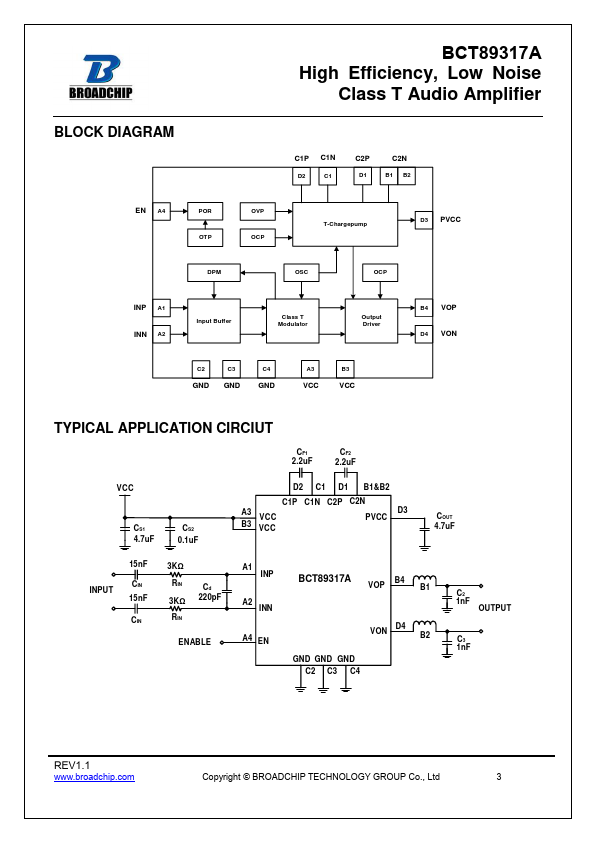 BCT89317A is specifically designed to enhance smart mobile phone sound quality, which is an innovative high efficiency, low noise, ultra-low distortion, constant large volume, Class T audio amplifier, using our unique Digital Power Modulation (DPM) audio algorithm, effectively eliminate audio noise, increase signal dynamic range which will greatly improve sound quality and volume.