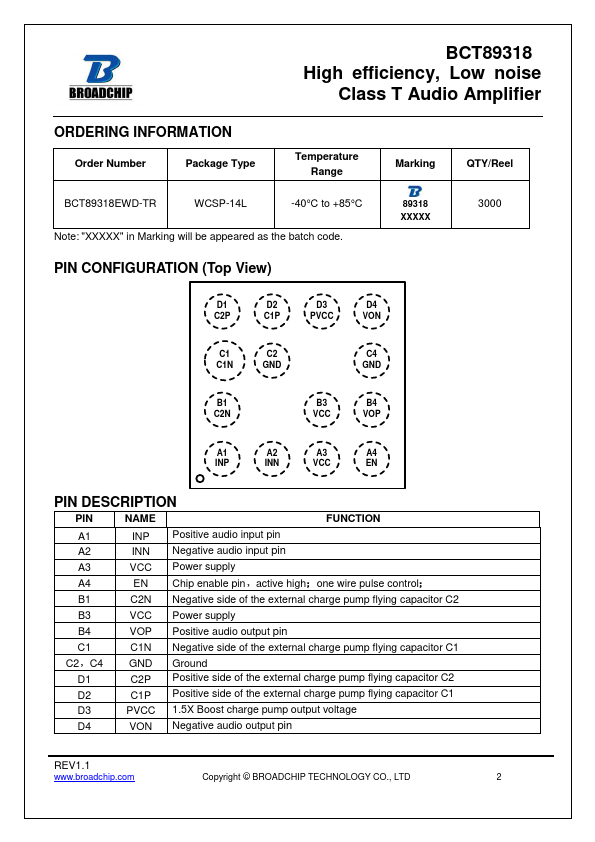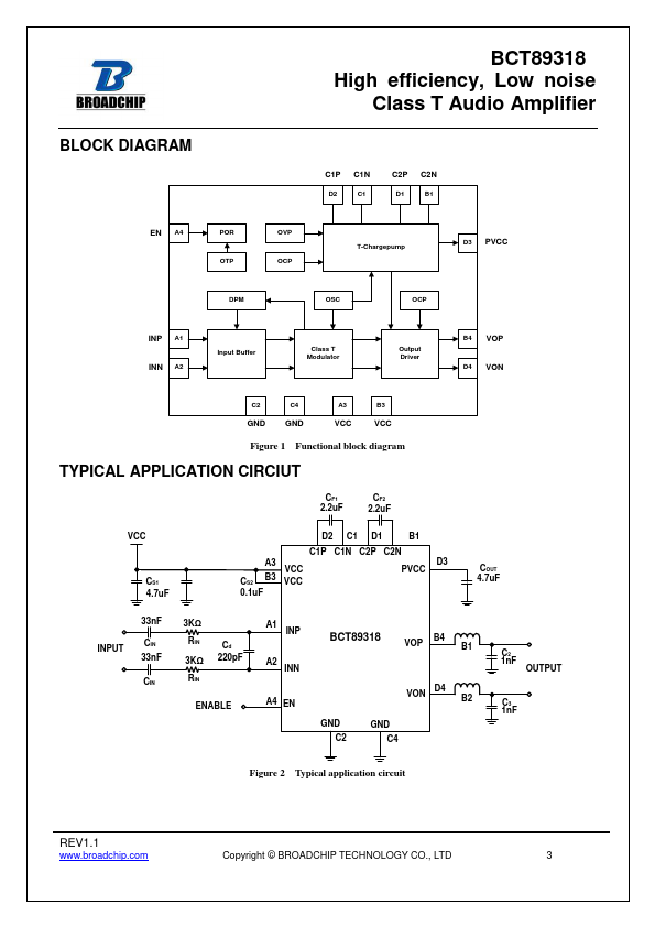 BCT89318 is specifically designed to enhance smart mobile phone sound quality, which is an innovative high efficiency, low noise, ultra-low distortion, constant large volume, Class T audio amplifier, Using our unique Digital Power Modulation(DPM) audio algorithm, effectively eliminate audio noise, increase signal Dynamic range which will greatly improve sound quality and volume.