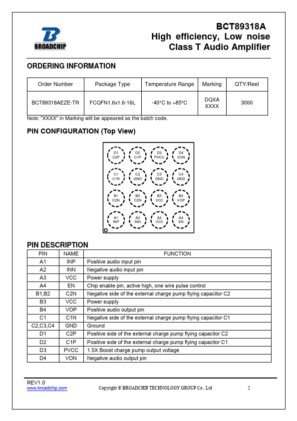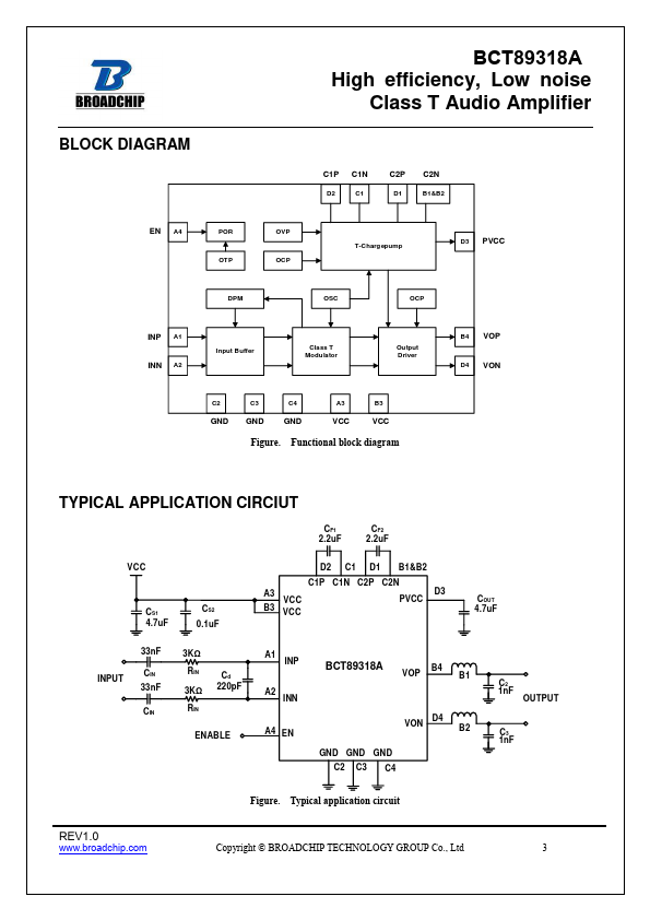BCT89318A is specifically designed to enhance smart mobile phone sound quality, which is an innovative high efficiency, low noise, ultra-low distortion, constant large volume, Class T audio amplifier, using our unique Digital Power Modulation (DPM) audio algorithm, effectively eliminate audio noise, increase signal Dynamic range which will greatly improve sound quality and volume.