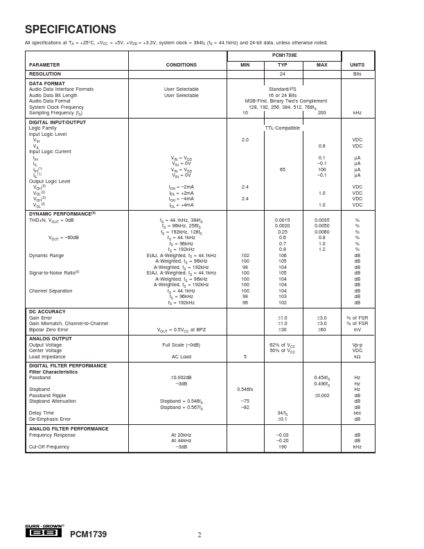 q ANALOG PERFORMANCE (VCC = +5V): Dynamic Range: 106dB typ SNR: 105dB typ THD+N: 0.0015% typ Full-Scale Output: 3.1Vp-p typ