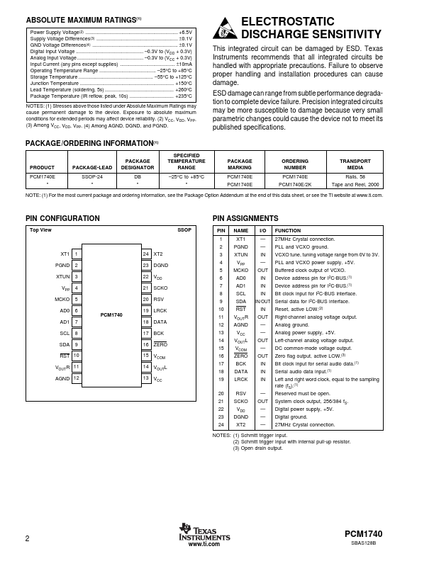 The PCM1740 is a complete stereo audio digital-toanalog converter with on-chip PLL and VCXO.