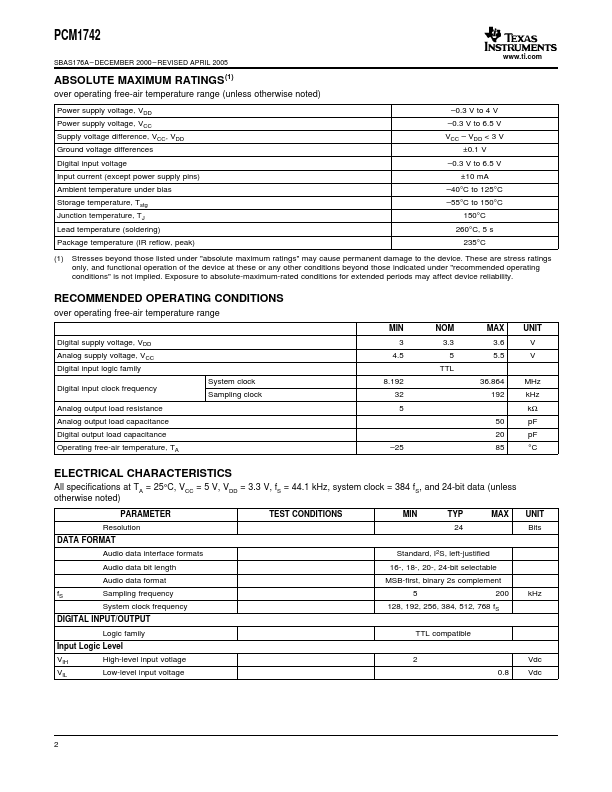 SBAS176A – DECEMBER 2000 – REVISED APRIL 2005
