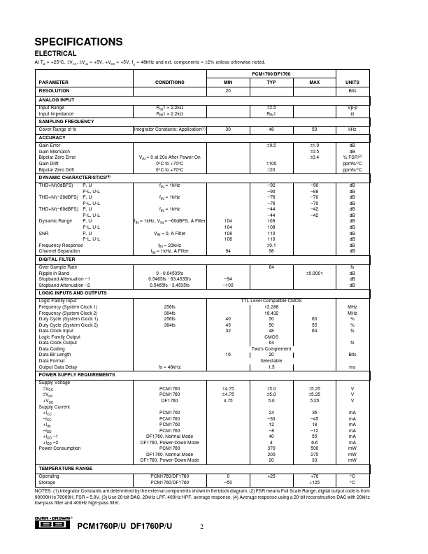 The PCM1760 and DF1760 combine for a low-cost, high-performance dual 20-bit, 48kHz sampling analog-to-digital conversion system which is specifically designed for dynamic applications.