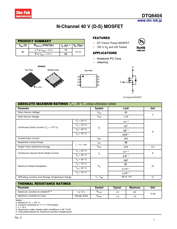 FEATURES • DT-Trench Power MOSFET • 100 % Rg and UIS Tested