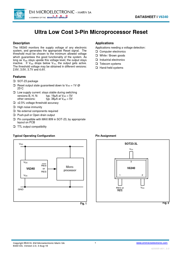 | V6310 | Ultra Low Power 3-Pin Voltage Window Surveillance |