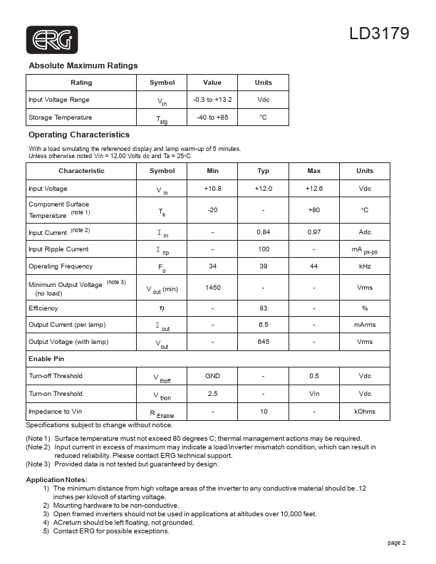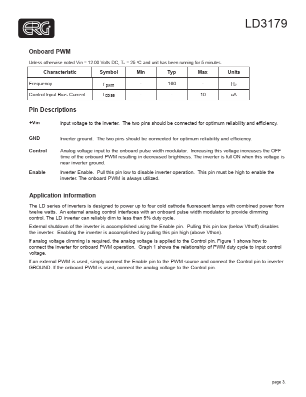 J1-1 ACout J1-2 ACreturn J2-1 +Vin J2-2 +Vin J2-3 GND J2-4 GND J2-5 Enable J2-6 Control J2-7 N/C J2-8 N/C J3-1 ACout J3-2 ACreturn page 1. LD3179 Absolute Maximum Ratings Rating Symbol Value Units Input Voltage Range Vin -0.3 to +13.2 Vdc Storage Temperature Tstg -40 to +85 oC Operating Characteristics With a load simulating the referenced display and lamp warm-up of 5 minutes.Unless otherwise noted Vin = 12.00 Volts dc and Ta = 25oC.Characteristic Symbol Min Typ Max