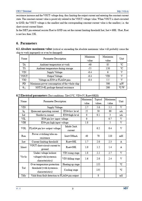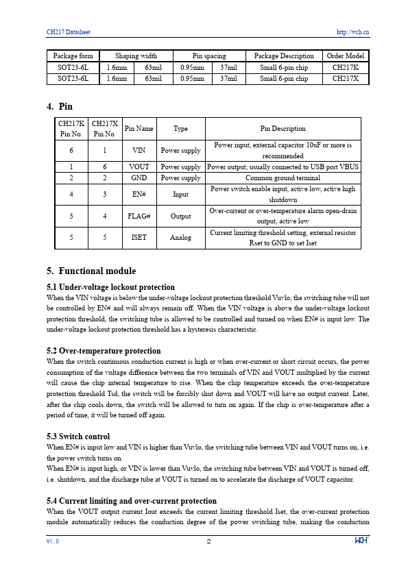 Small 6-pin chip Small 6-pin chip Order Model CH217K CH217X 4. Pin CH217K Pin No.6 1 2 4 3 5 CH217X Pin No.1 6 2 3 4 5 Pin Name VIN VOUT GND EN# FLAG# ISET Type Power supply Power supply Power supply Input Output Analog Pin Description Power input, external capacitor 10uF or more is recommended Power output, usually connected to USB port VBUS Common ground terminal Power switch enable input, active low, active high shutdown Over-current or over-temperature alarm open-drain output, activ