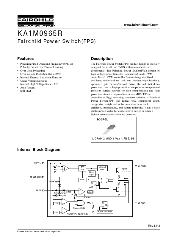 The Fairchild Power Switch(FPS) product family is specially designed for an off line SMPS with minimal external components. The Fairchild Power Switch(FPS) consist of high voltage power SenseFET and current mode PWM controller IC.