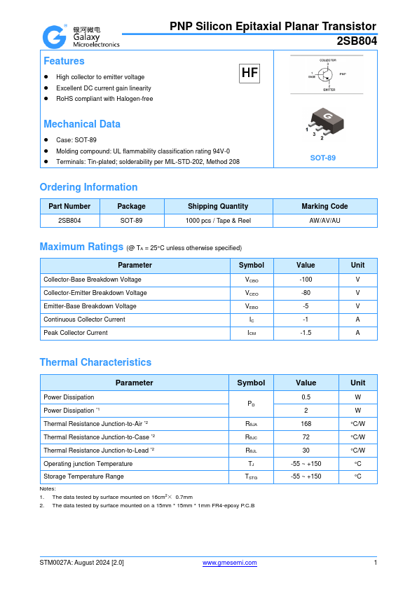 Case: SOT-89 Molding compound: UL flammability classification rating 94V-0 Terminals: Tin-plated; solderability per MIL-STD-202, Method 208