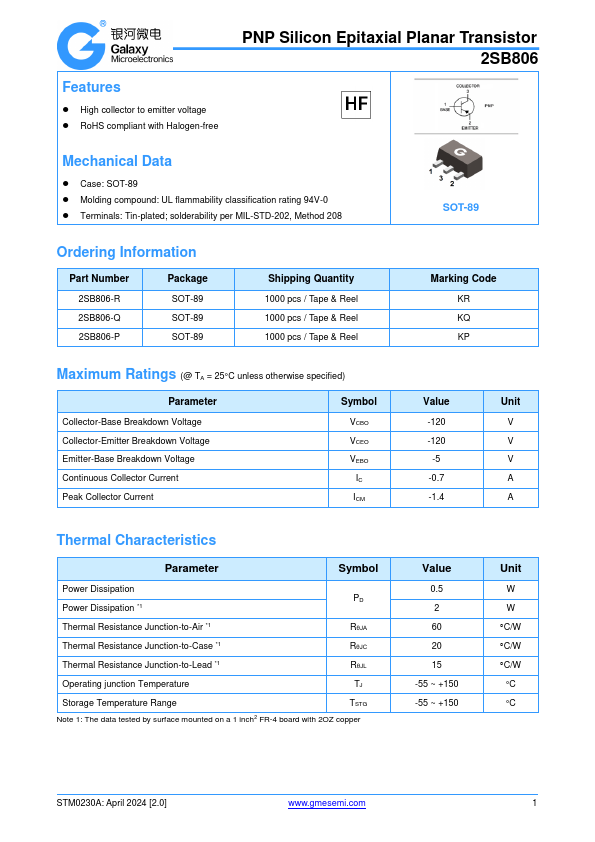 Case: SOT-89 Molding compound: UL flammability classification rating 94V-0 Terminals: Tin-plated; solderability per MIL-STD-202, Method 208