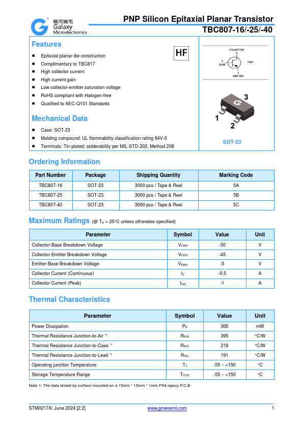 PNP Silicon Epitaxial Planar Transistor TBC807-16/-25/-40 Features  Epitaxial planar die construction  Complimentary to TBC817  High collector current  High current gain  Low collector-emitter saturation voltage  RoHS compliant with Halogen-free  Qualified to AEC-Q101 Standards Mechanical Data  Case: SOT-23  Molding compound: UL flammability classification rating 94V-0  Terminals: Tin-plated; solderability per MIL-STD-202, Method 208 SOT-23 Ordering Information Part Number TBC807-16 TBC807-25 TBC807-40 Package SOT-23 SOT-23 SOT-23 Shipping Quantity 3000 pcs / Tape & Reel 3000 pcs / Tape & Reel 3000 pcs / Tape & Reel Marking Code 5A 5B 5C Maximum Ratings (@ TA = 25°C unless otherwise specified) Parameter Collector-Base Breakdown Voltage Collector-Emitter Breakdown Voltage