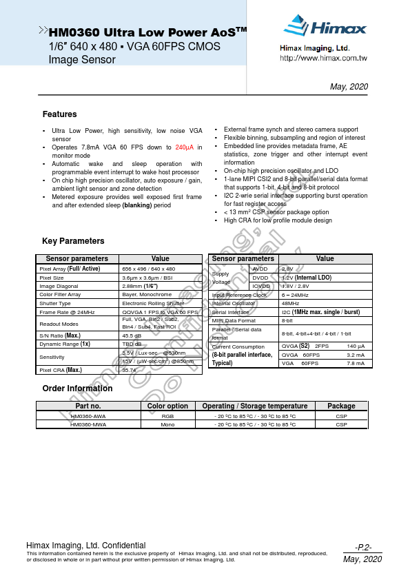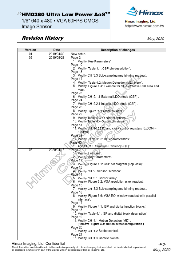 of changes New setup.Page 2 1. Modify ‘Key Parameters’ Page 10 2. Modify ‘Table 1.1: CSP pin description’.Page 13 3. Modify CH ‘3.3 Sub-sampling and binning readout’.Page 17 4. Modify ‘Table 4.2: Motion Detection (MD) block’.5. Modify ‘Figure 4.4: Example for VGA effective ROI area and map’.Page 23 6. Modify CH ‘5.1.1 External LDO mode (CSP)’.Page 24 7. Modify CH ‘5.2.1 Internal LDO mode (CSP)’.Page 28 8. Modify Figure ‘6.4 Clock dividers’.Page 29 9. Modify Table ’6.3 IO control options’