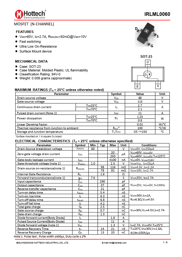 FEATURES VDS=60V, ID=2.7A, RDS(ON)<92mΩ@VGS=10V Fast switching Ultra Low On-Resistance Surface Mount device