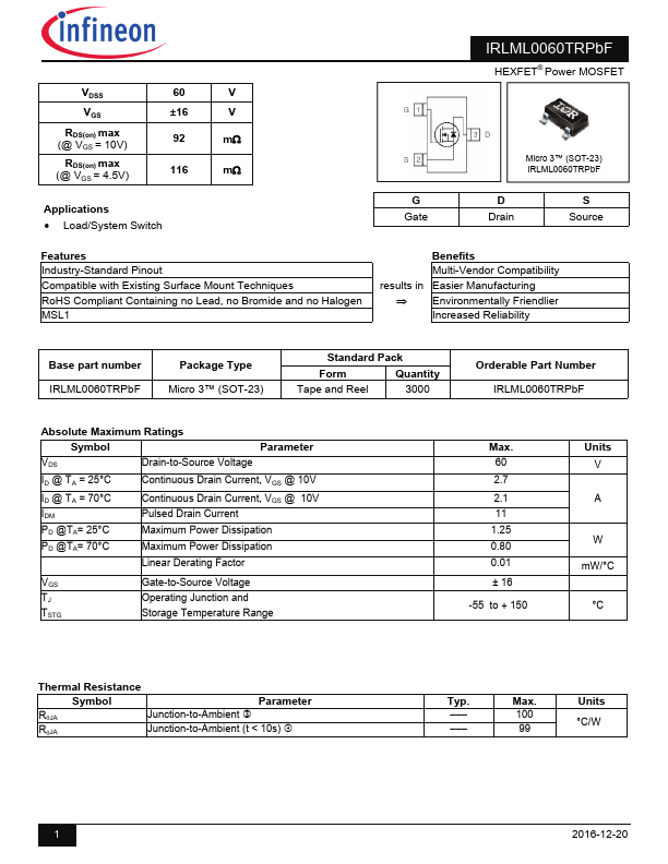 | IRLML0060TRPBF | HEXFET Power MOSFET | International Rectifier |