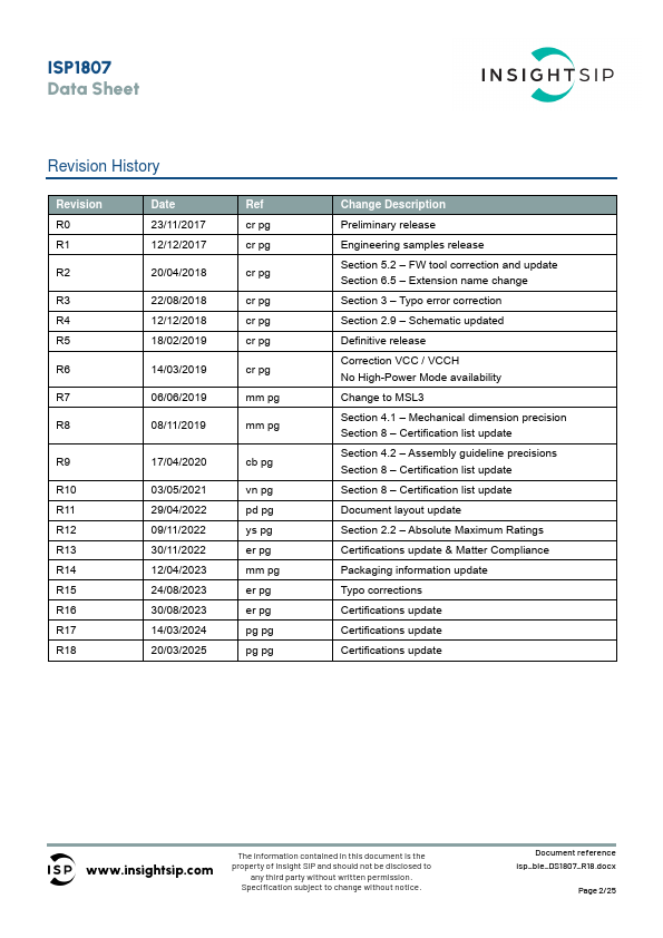 Preliminary release Engineering samples release Section 5.2 FW tool correction and update Section 6.5 Extension name change Section 3 Typo error correction Section 2.9 Schematic updated Definitive release Correction VCC / VCCH No High-Power Mode availability Change to MSL3 Section 4.1 Mechanical dimension precision Section 8 Certification list update Section 4.2 Assembly guideline precisions Section 8 Certification l