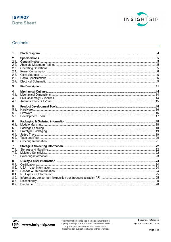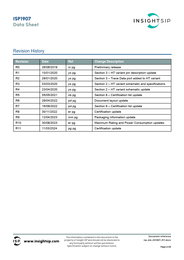 Preliminary release Section 3 HT variant pin description update Section 3 Trace Data port added to HT variant Section 2 HT variant schematic and specifications Section 2 HT variant schematic update Section 8 Certification list update Document layout update Section 8 Certification list update Certification update Packaging information update Maximum Rating and Power Consumption updates Certification update www.insightsip.com The inform
