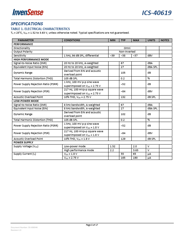 The ICS‐40619 is an analog MEMS microphone with very high SNR and a low‐power AlwaysOn mode.
