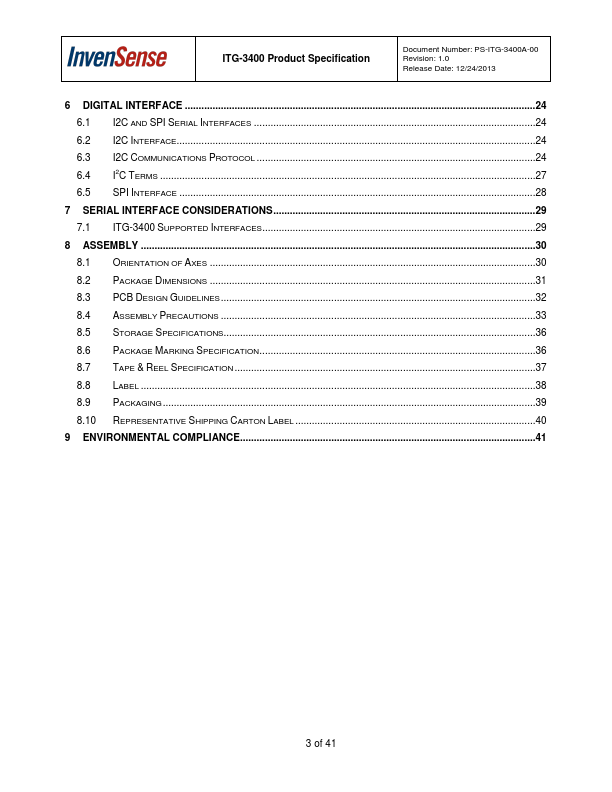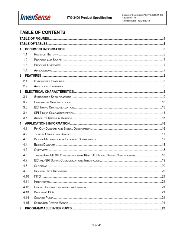 16 4.2 TYPICAL OPERATING CIRCUIT17 4.3 BILL OF MATERIALS FOR EXTERNAL COMPONENTS 17 4.4 BLOCK DIAGRAM 18 4.5 OVERVIEW 18 4.6 THREE-AXIS MEMS GYROSCOPE WITH 16-BIT ADCS AND SIGNAL CONDITIONING18 4.7 I2C AND SPI SERIAL COMMUNICATIONS INTERFACES 19 4.8 CLOCKING 20 4.9 SENSOR DATA REGISTERS20 4.10 FIFO 21 4.11 INTERRUPTS 21 4.12 DIGITAL-OUTPUT TEMPERATURE SENSOR 21 4.13 BIAS AND LDOS 21 4.14 CHARGE PUMP 21 4.15 STANDARD POWER MODES 21 5 PROGRAMMABLE INTERRUPTS