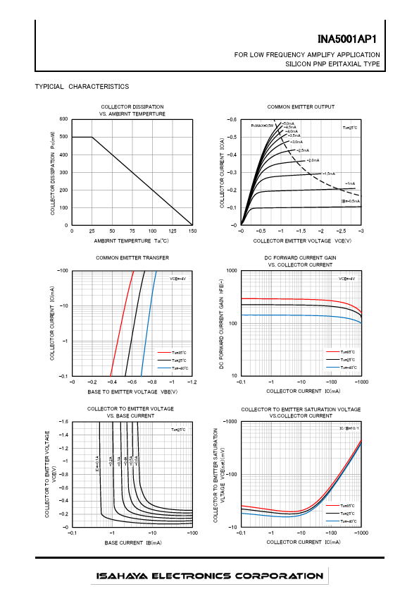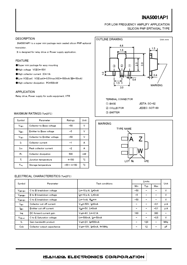 INA5001AP1 is a super mini package resin sealed silicon PNP epitaxial transistor. It is designed for relay drive or Power supply application.