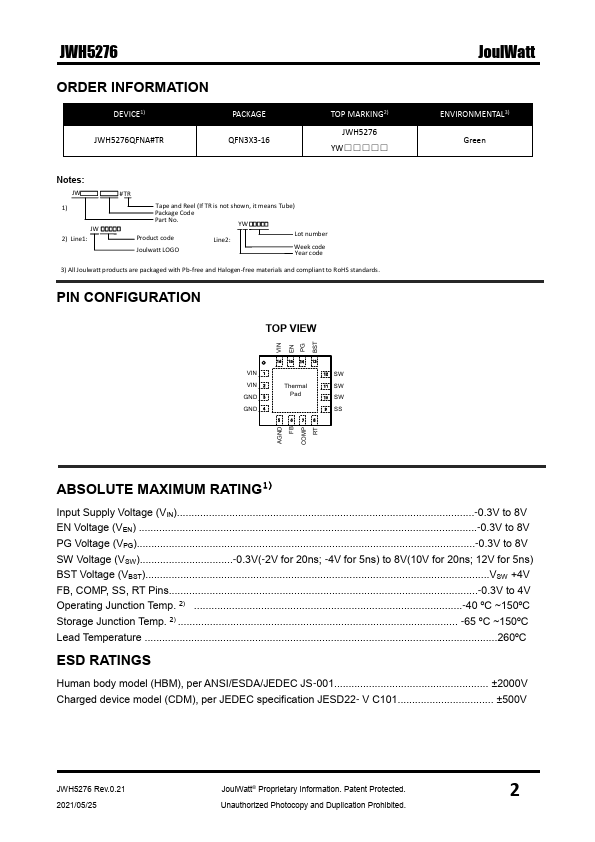 The JWH®5276 is a monolithic buck switching regulator based on a proprietary I2 control for fast transient response.