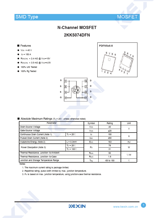 ● VDS = 40 V ● ID = 150 A ● RDS(ON) < 2.4 mΩ @ VGS=10V ● RDS(ON) < 3.5 mΩ @ VGS=4.5V ● 100% UIS Tested ● 100% Rg Tested