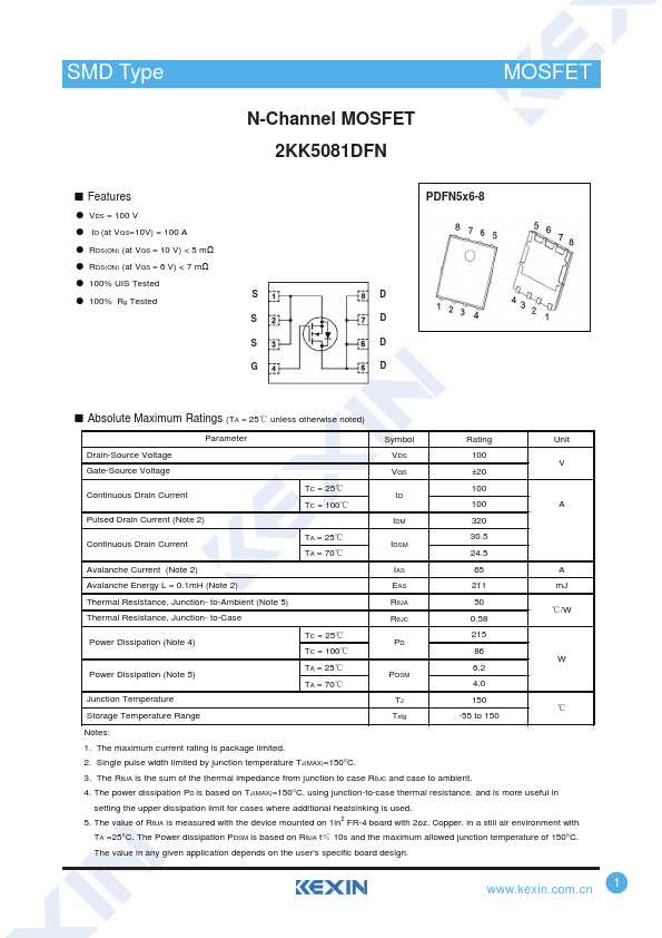 ● VDS = 100 V ● ID (at VGS=10V) = 100 A ● RDS(ON) (at VGS = 10 V) < 5 mΩ ● RDS(ON) (at VGS = 6 V) < 7 mΩ ● 100% UIS Tested