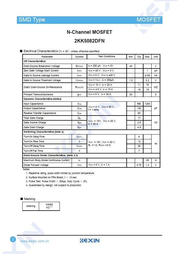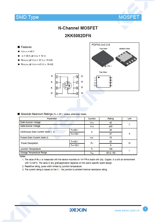 ● VDS (V) = 40 V ● ID = 35 A (at VGS = 10 V) ● RDS(ON) (at VGS = 10 V) < 15 mΩ ● RDS(ON) (at VGS = 4.5 V) < 19 mΩ