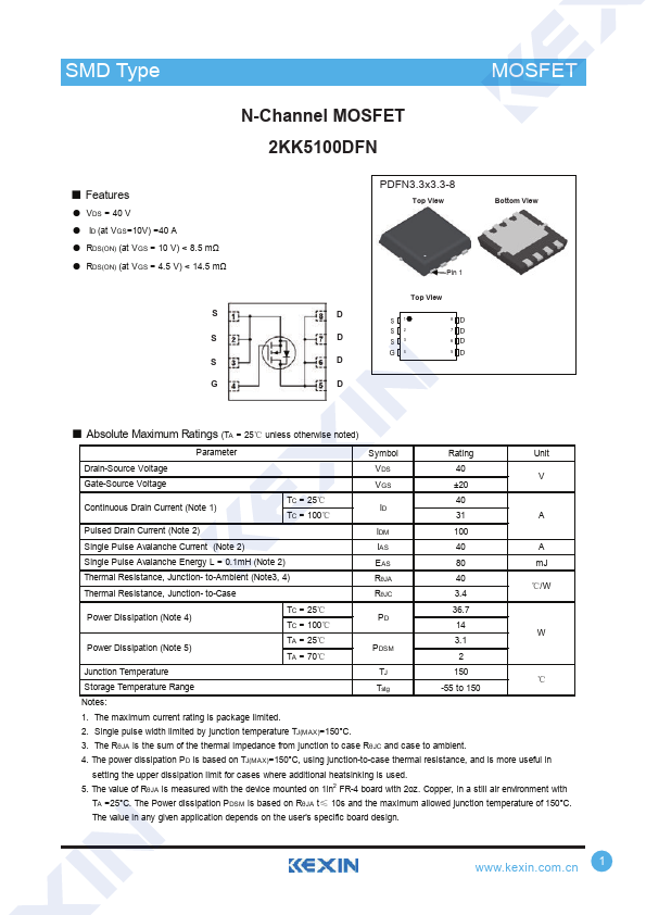 ● VDS = 40 V ● ID (at VGS=10V) =40 A ● RDS(ON) (at VGS = 10 V) < 8.5 mΩ ● RDS(ON) (at VGS = 4.5 V) < 14.5 mΩ