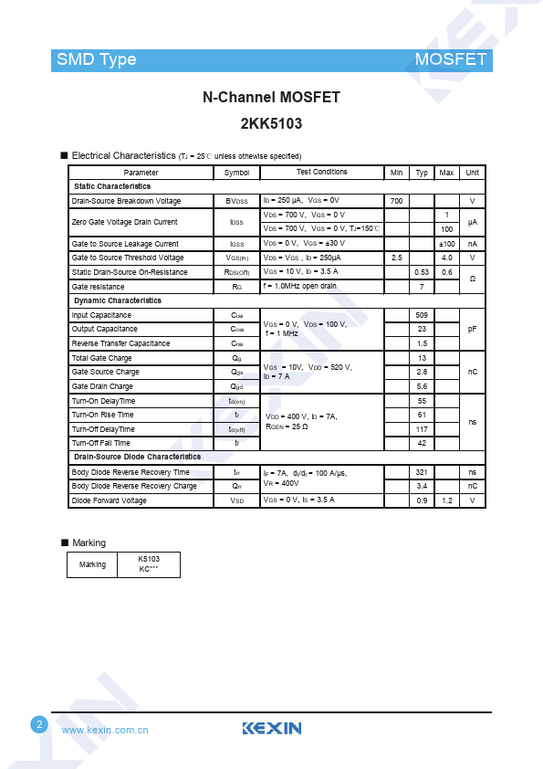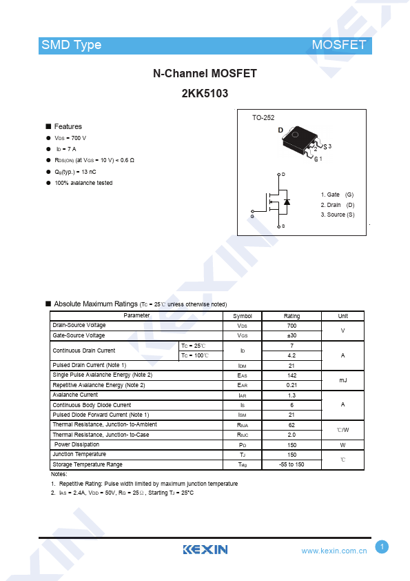 ● VDS = 700 V ● ID = 7 A ● RDS(ON) (at VGS = 10 V) < 0.6 Ω ● Qg(typ.) = 13 nC ● 100% avalanche tested