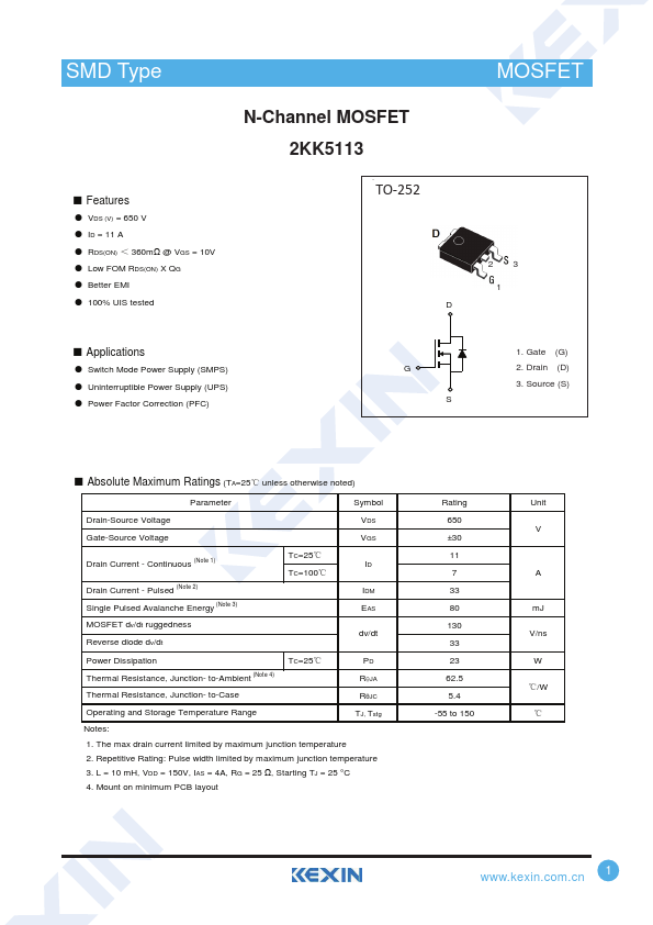 ● VDS (V) = 650 V ● ID = 11 A ● RDS(ON) < 360mΩ @ VGS = 10V ● Low FOM RDS(ON) X QG ● Better EMI ● 100% UIS tested