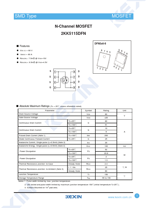 ● VDS (V) = 60 V ● IDMAX = 80 A ● RDS(ON) < 7.5mΩ @ VGS=10V ● RDS(ON) < 9.5mΩ @ VGS=4.5V