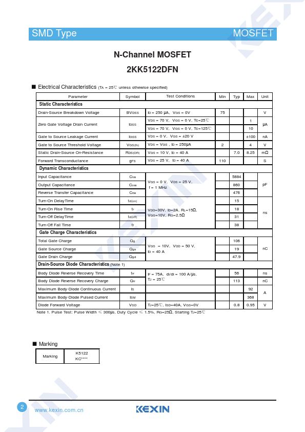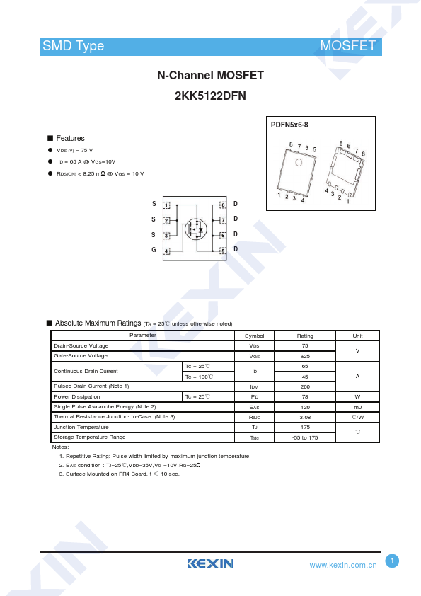 ● VDS (V) = 75 V ● ID = 65 A @ VGS=10V ● RDS(ON) < 8.25 mΩ @ VGS = 10 V