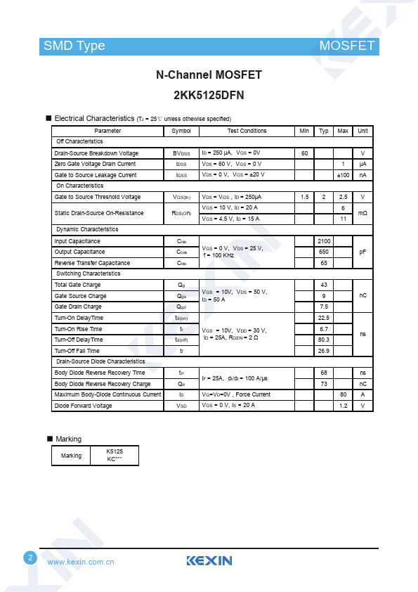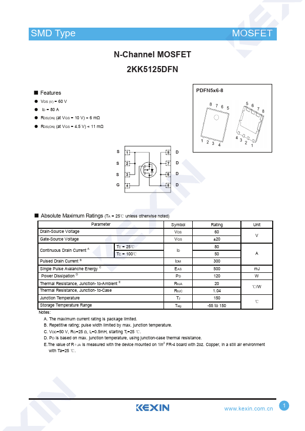 ● VDS (V) = 60 V ● ID = 80 A ● RDS(ON) (at VGS = 10 V) < 6 mΩ ● RDS(ON) (at VGS = 4.5 V) < 11 mΩ