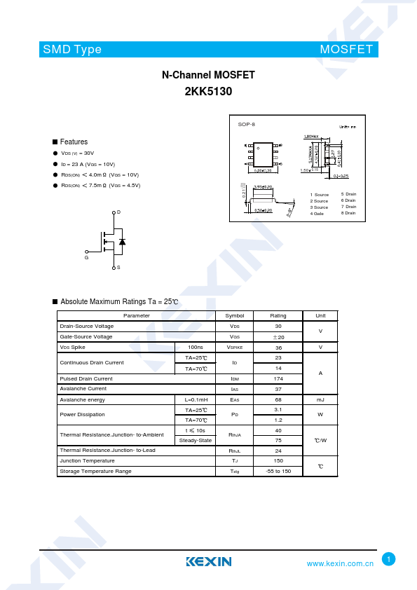 VDS (V) = 30V ID = 23 A (VGS = 10V) RDS(ON) 4.0m (VGS = 10V) RDS(ON) 7.5m (VGS = 4.5V)