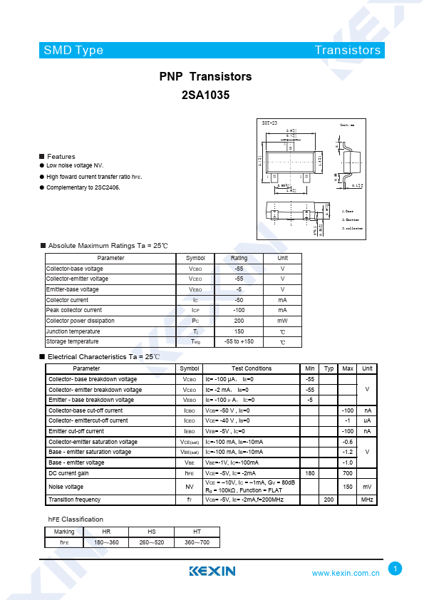 ● Low noise voltage NV. ● High foward current transfer ratio hFE. ● Complementary to 2SC2406.