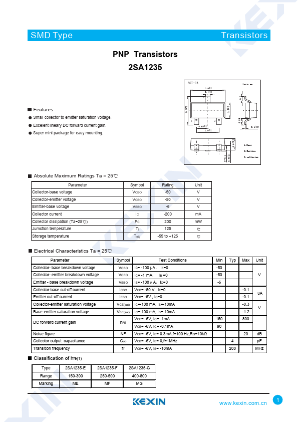 Small collector to emitter saturation voltage. Excelent lineary DC forward current gain. Super mini package for easy mounting.