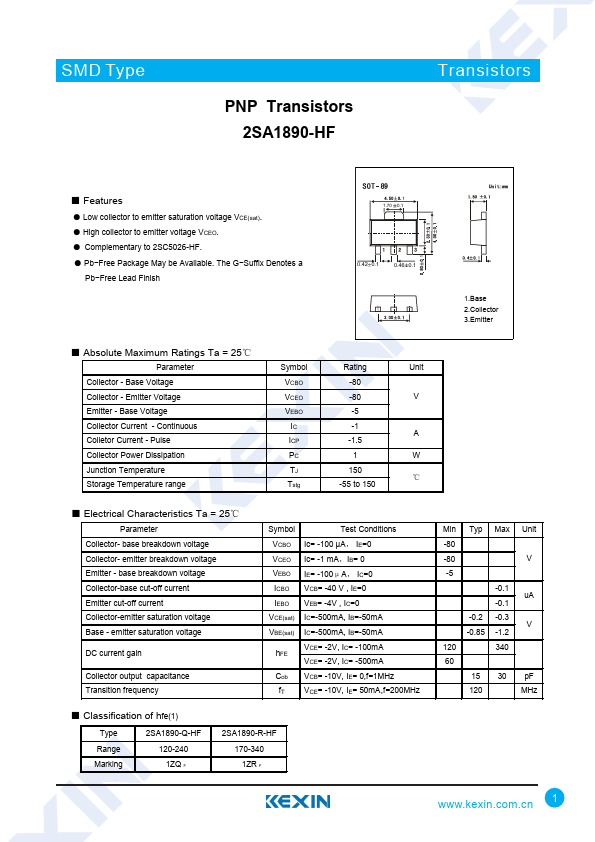 | 2SA1890 | Silicon PNP epitaxial planer type Transistor | Panasonic Semiconductor |