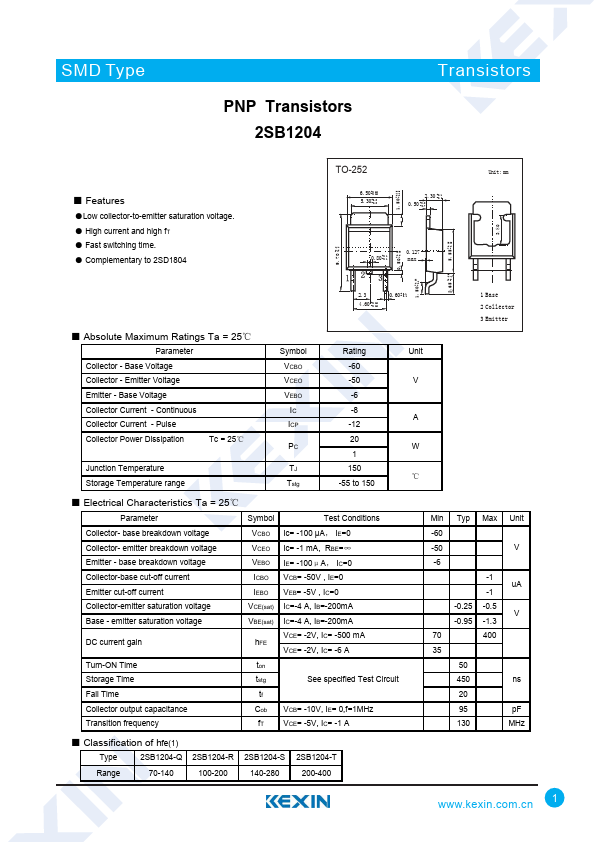 ●Low collector-to-emitter saturation voltage. ● High current and high fT ● Fast switching time. ● Complementary to 2SD1804