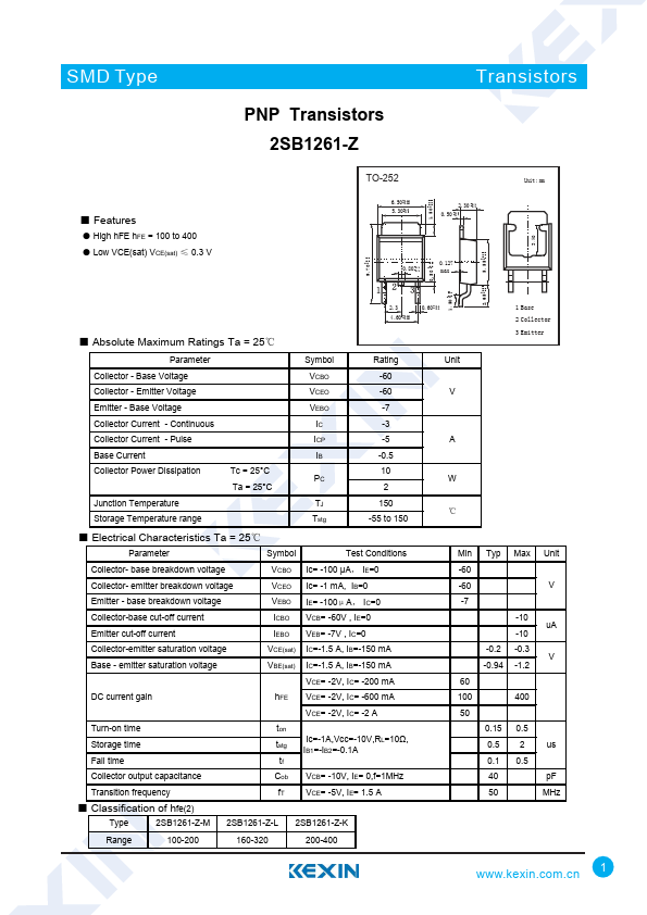 ● High hFE hFE = 100 to 400 ● Low VCE(sat) VCE(sat) ≤ 0.3 V