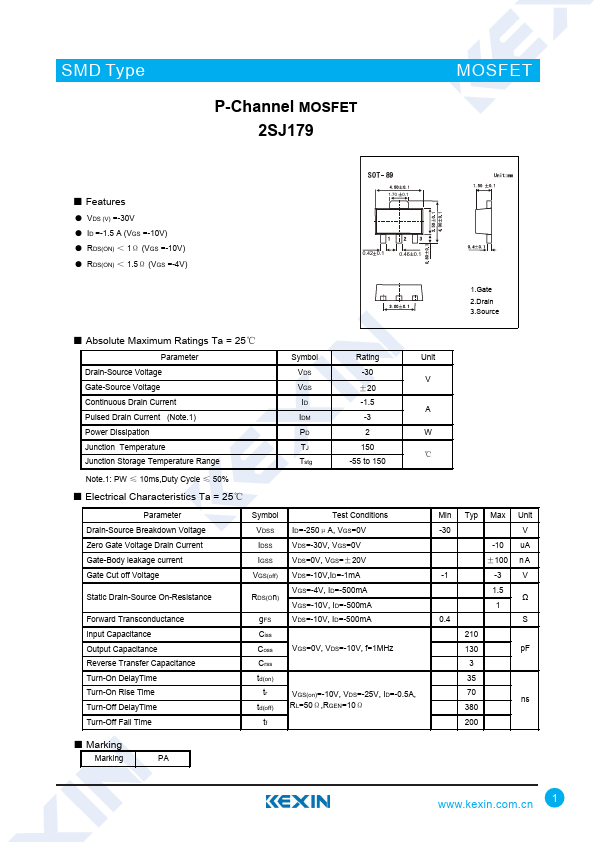 ● VDS (V) =-30V ● ID =-1.5 A (VGS =-10V) ● RDS(ON) < 1Ω (VGS =-10V) ● RDS(ON) < 1.5Ω (VGS =-4V)