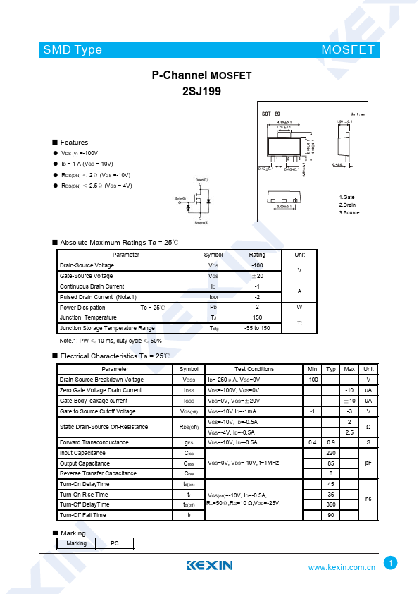 ● VDS (V) =-100V ● ID =-1 A (VGS =-10V) ● RDS(ON) < 2Ω (VGS =-10V) ● RDS(ON) < 2.5Ω (VGS =-4V)