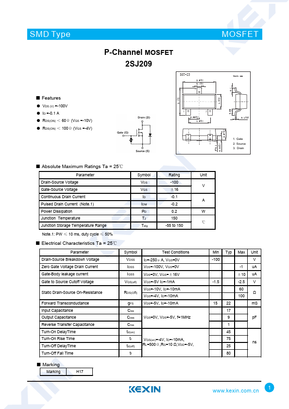 ● VDS (V) =-100V ● ID =-0.1 A ● RDS(ON) < 60Ω (VGS =-10V) ● RDS(ON) < 100Ω (VGS =-4V)