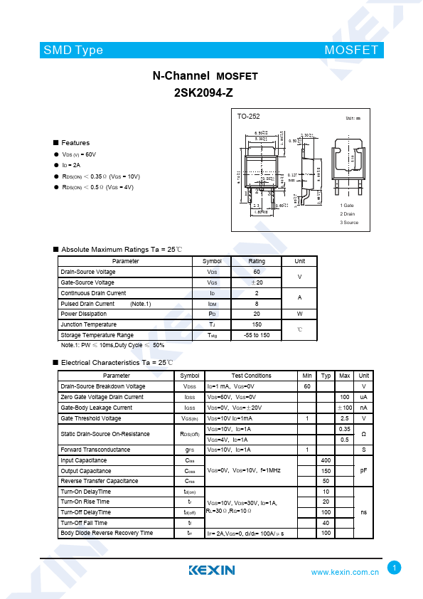 ● VDS (V) = 60V ● ID = 2A ● RDS(ON) < 0.35Ω (VGS = 10V) ● RDS(ON) < 0.5Ω (VGS = 4V)