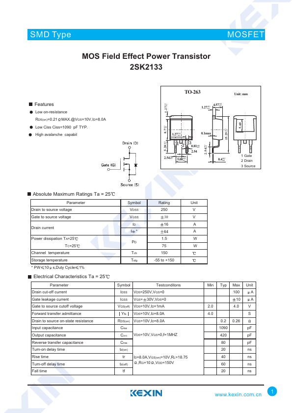 Low on-resistance RDS(on)=0.21 MAX.@VGS=10V,ID=8.0A Low Ciss Ciss=1090 pF TYP. High avalanche capabil