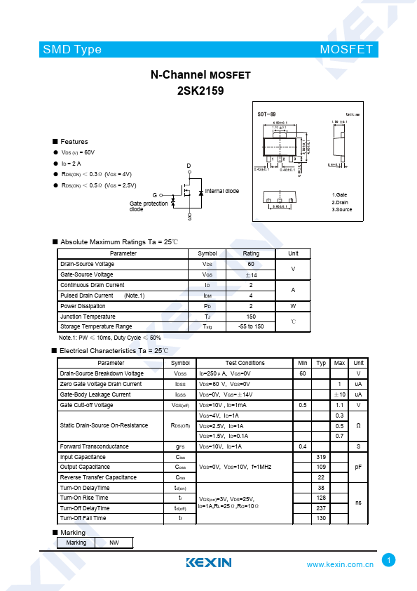 ● VDS (V) = 60V ● ID = 2 A ● RDS(ON) < 0.3Ω (VGS = 4V) ● RDS(ON) < 0.5Ω (VGS = 2.5V)